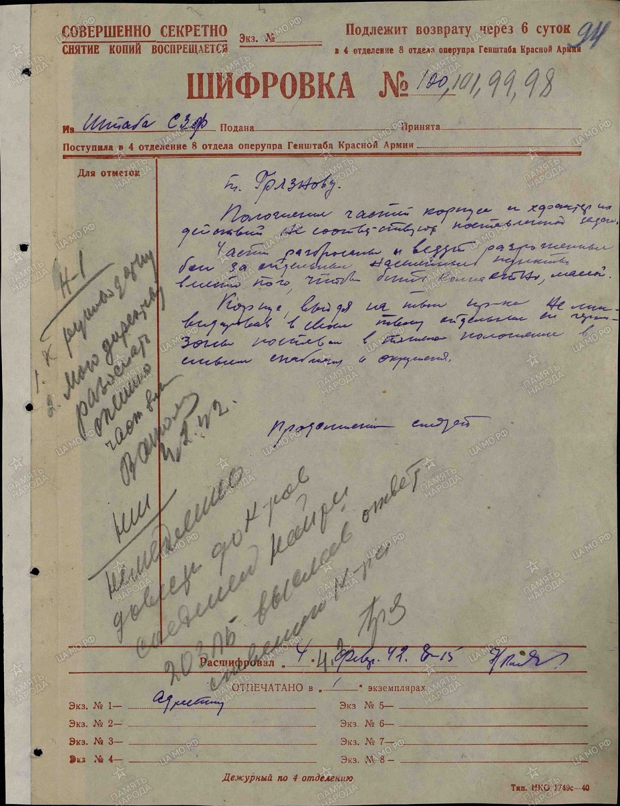 Доклад об итогах боевых действий на фронте 1 ГСК за 15.4.42 г.